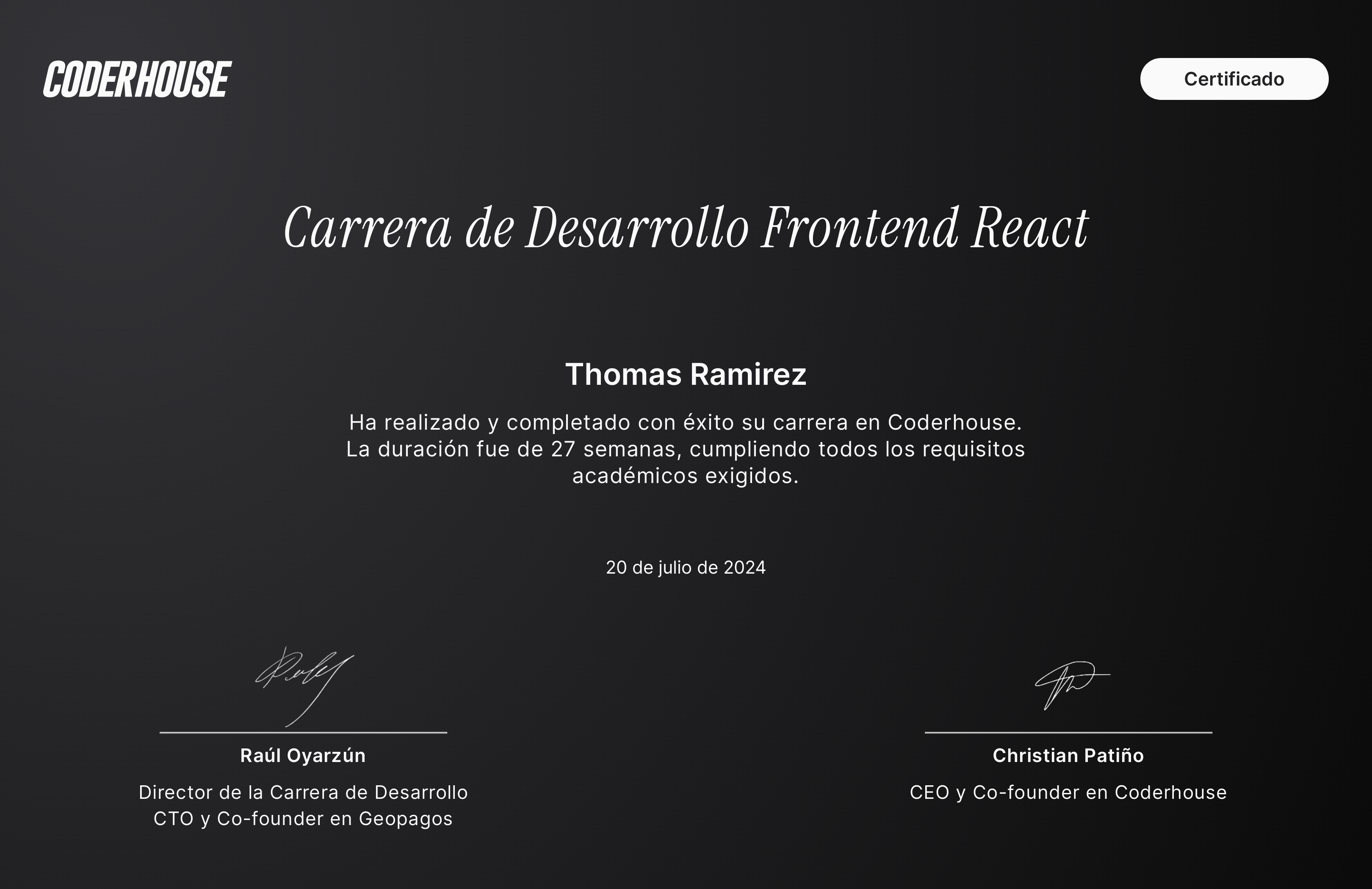 Me llamo Thomás Ramírez, nací el 15 de marzo de 2004. Soy un apasionado del desarrollo web y me especialicé en desarrollo frontend con React durante mi formación en Coderhouse.