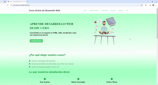 Creé una página ficticia para un curso de desarrollo web, diseñada para mostrar cómo se pueden adaptar los sitios a diferentes profesiones. La página destaca los beneficios del curso, haciendo énfasis en la propuesta de valor y los servicios ofrecidos. Este proyecto demuestra mi capacidad para crear páginas informativas y atractivas, que pueden ser personalizadas para cualquier tipo de oferta educativa o profesional.