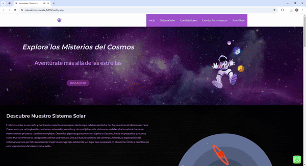 Desarrollé esta página enfocada en la divulgación científica, específicamente sobre el espacio. Presenta datos fascinantes y sucesos del cosmos de manera organizada y visualmente atractiva. El objetivo es ofrecer un espacio informativo para aquellos interesados en el universo, mostrando cómo las landing pages pueden servir para difundir contenido educativo o de entretenimiento en diferentes áreas.